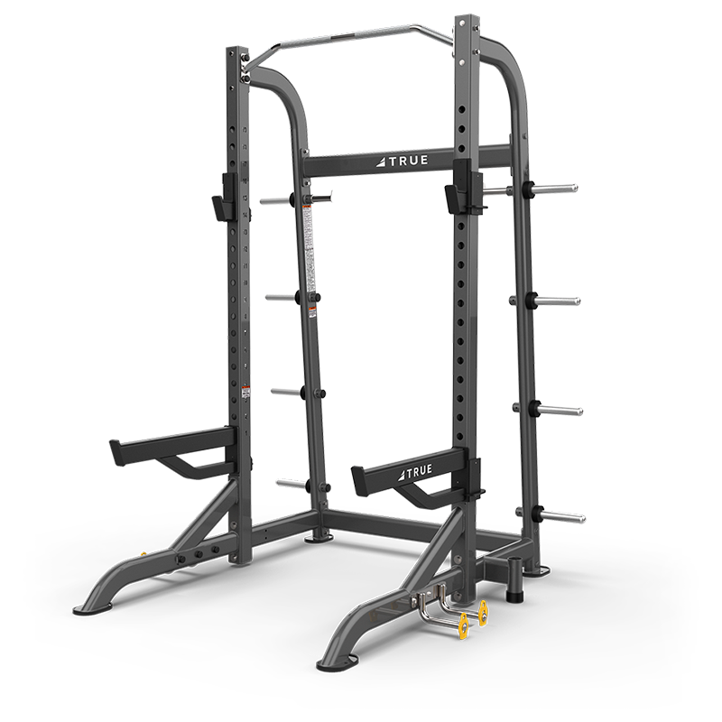 Jykevä, laadukas räkki jossa on helposti säädettävät turvaraudat sekä tangon pidikkeet. Räkissä on kuminauhoille paikat sekä useat painotapit levypainojen säilyttämiseen.